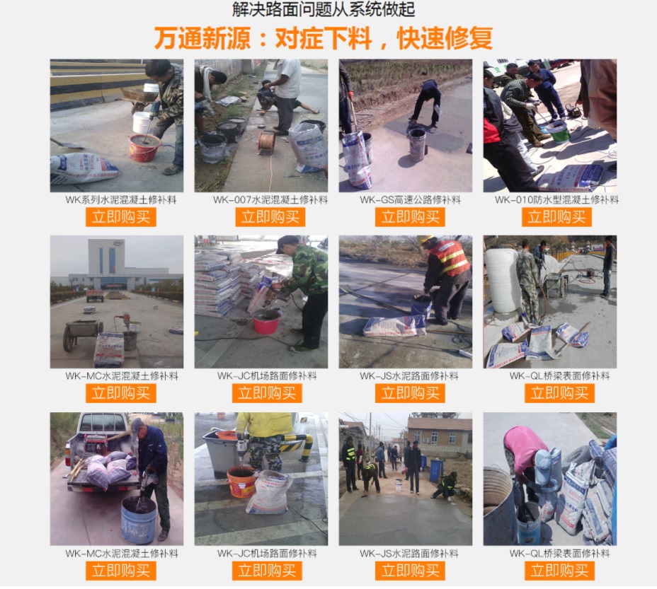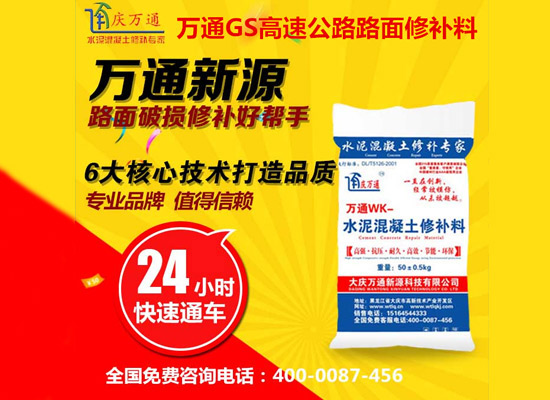 大慶萬通新源科技有限公司獨有的混凝土路面高強速補料,是水泥混凝土路面病害修復的好材料。疲勞、凍融循環(huán)、彎曲壓力、滲水和基層破壞等原因都會引起水泥路面的破損,從而帶來高昂的維護費用。與以往的剛性修補方法不同,混凝土水泥路面維修速補膠提供了一種獨特的柔性修補產品和技術,高柔性、高抗拉性,可跨伸縮縫施工和高抗壓性使得混凝土快補產品為水泥混凝土路面提供了******性的修補。傳統的剛性修補方案,如環(huán)氧砂漿和快干水泥產品,由于其自身的粘結失效,抗疲勞性低以及與原路面不同的伸縮系數,修補面會在短時間內失效或產生新的裂縫,需要反復修補,有效期短且費用高昂。大慶萬通新源科技有限公司的混凝土水泥路面維修速補膠可以隨原路面一起伸縮,移動,從而避免了粘結失效和產生新裂縫。萬通快補產品優(yōu)異的粘結性、柔韌性和高防滑性,特別適用于水泥路面的淺層粘合修補,多邊角混凝土板層修補,跨伸縮縫修補以及路面沉陷修補。萬通混凝土病害修補料針對混凝土起皮起沙、斷板裂縫、蜂窩麻面、坑槽露石子、漏筋掉皮、橋梁的掉皮漏筋快速通車使用時間長。應用萬通快補產品,施工后一天就可以恢復交通。大慶萬通新源科技有限公司的萬通水泥路面維修速補膠適用于高速公路、機場路面、農村村村通路面、廠坪、學校操場、市區(qū)公路、小區(qū)路面、橋梁、水泥路面的修補。使用萬通特快補材料修補路面可以一勞永逸! 水泥地面起砂怎么辦,混凝土修補劑混凝土地面起砂,混凝土地面修補,地面起砂怎么辦,